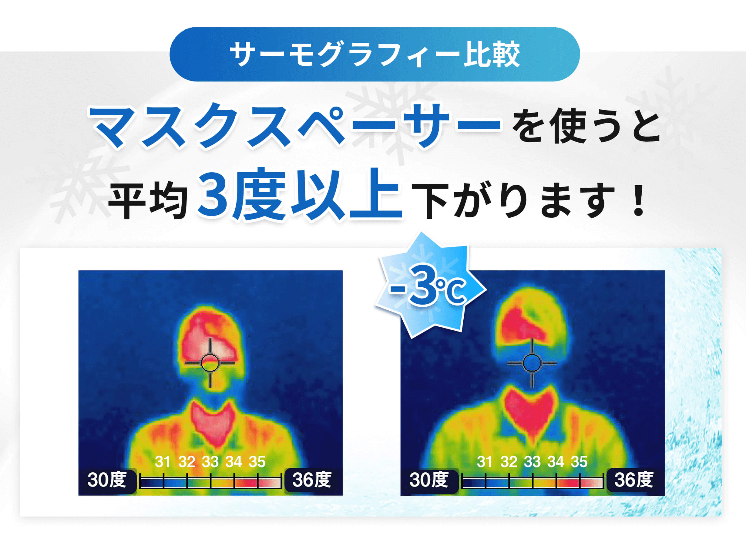 マスクスペーサーをつけていない状態・つけている状態の、マスク着用時の口元の色温度を見てわかる通り、マスクスペーサーを使用すると平均3度以上下がります!
