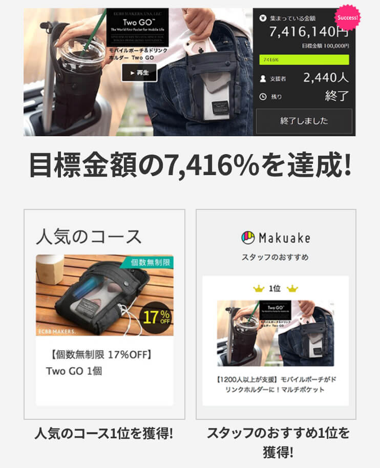 2018年にMakuakeで初お披露目した「Two Go(トゥーゴー)」(現在は「#2GO(トゥーゴー)」に名称が変わっています。)は人気のコース1位を獲得、スタッフのおすすめ1位を獲得し、あまりの勢いにTABILABOなど各種メディアでも紹介されました。